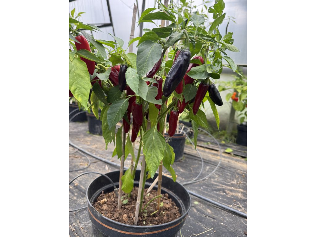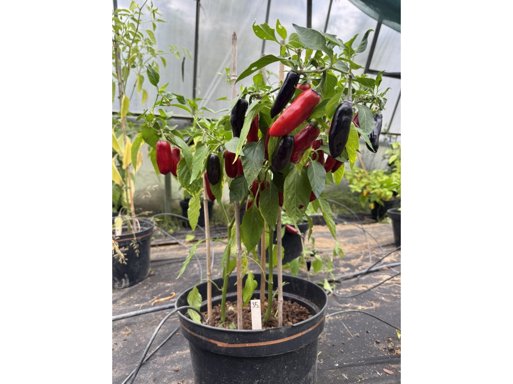 Rostlina: annuum, kompaktnější keř (cca 60–90 cm), velmi dekorativní díky tmavým plodům.