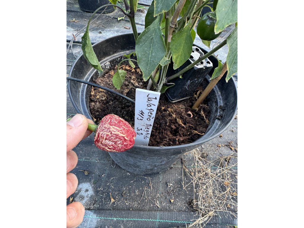 Plody: jalapeño typ, silnější stěna, dozrává do červené barvy, unikátní kulatý tvar se silným kornatěním plodu