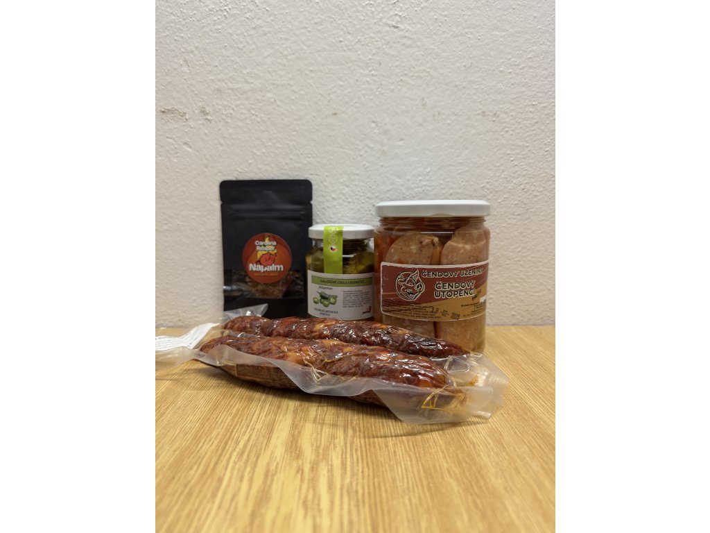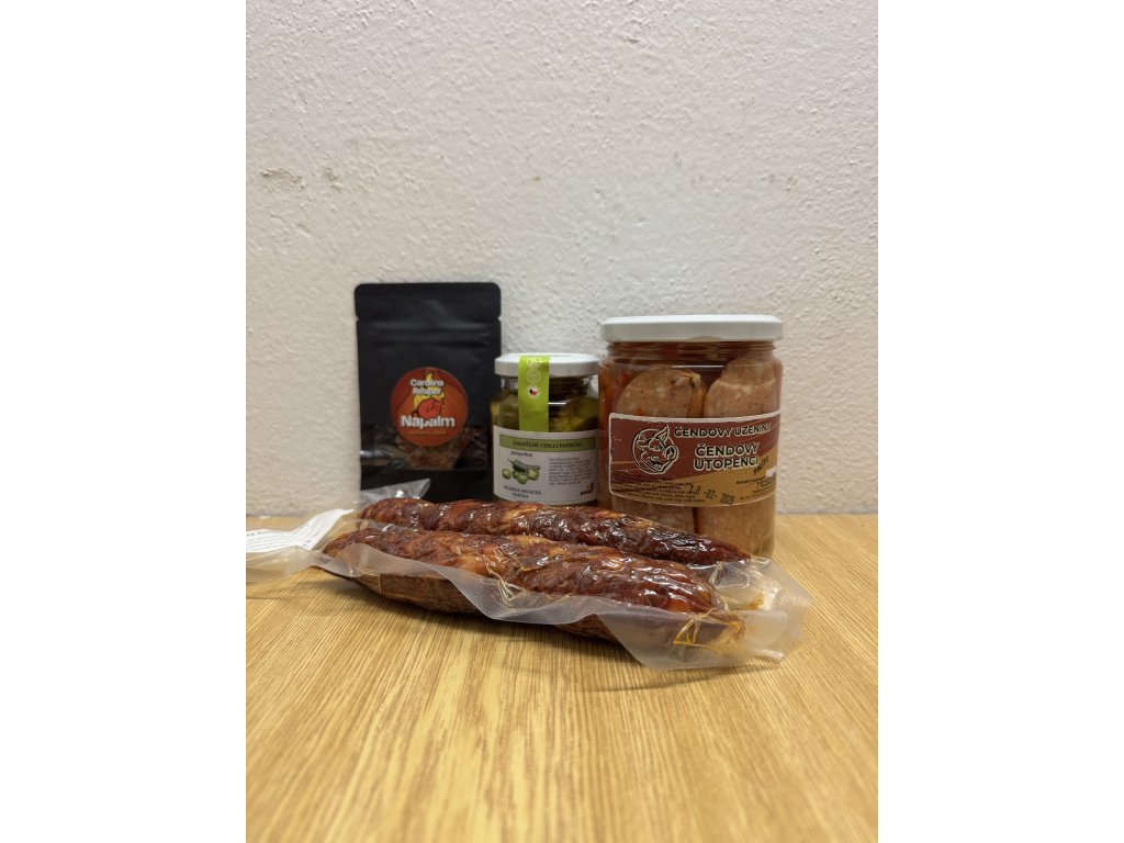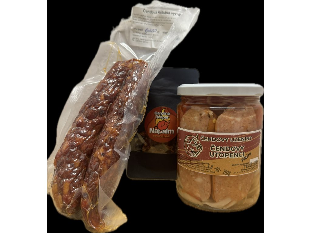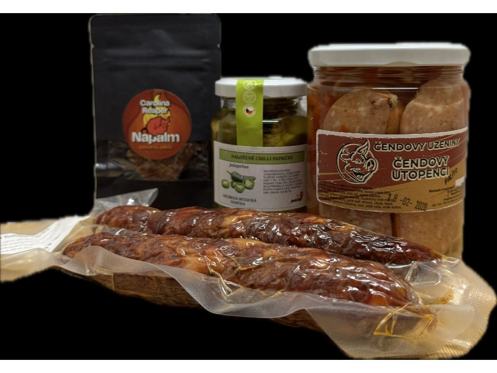 Party bez zobání? Neexistuje. Tenhle balíček staví na poctivých Čendových klobáskách (2 ks / cca 200 g) a doplňcích, které udělají na stole okamžitě party režim. Vyber si variantu podle chuti a odvahy – od pohodové kombinace s jalapeños až po Reaper challenge s NAPALMem.